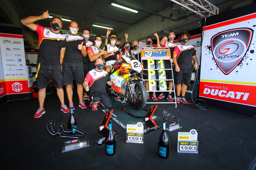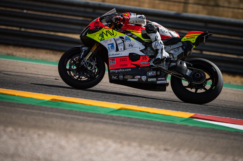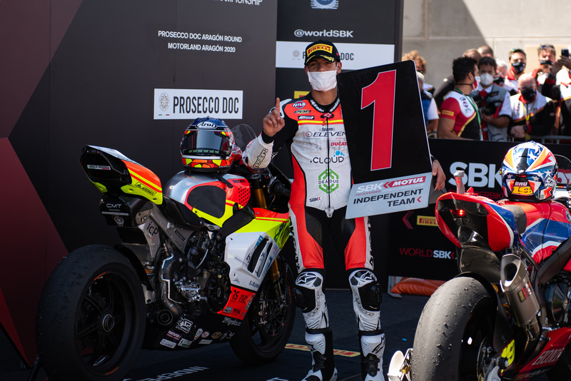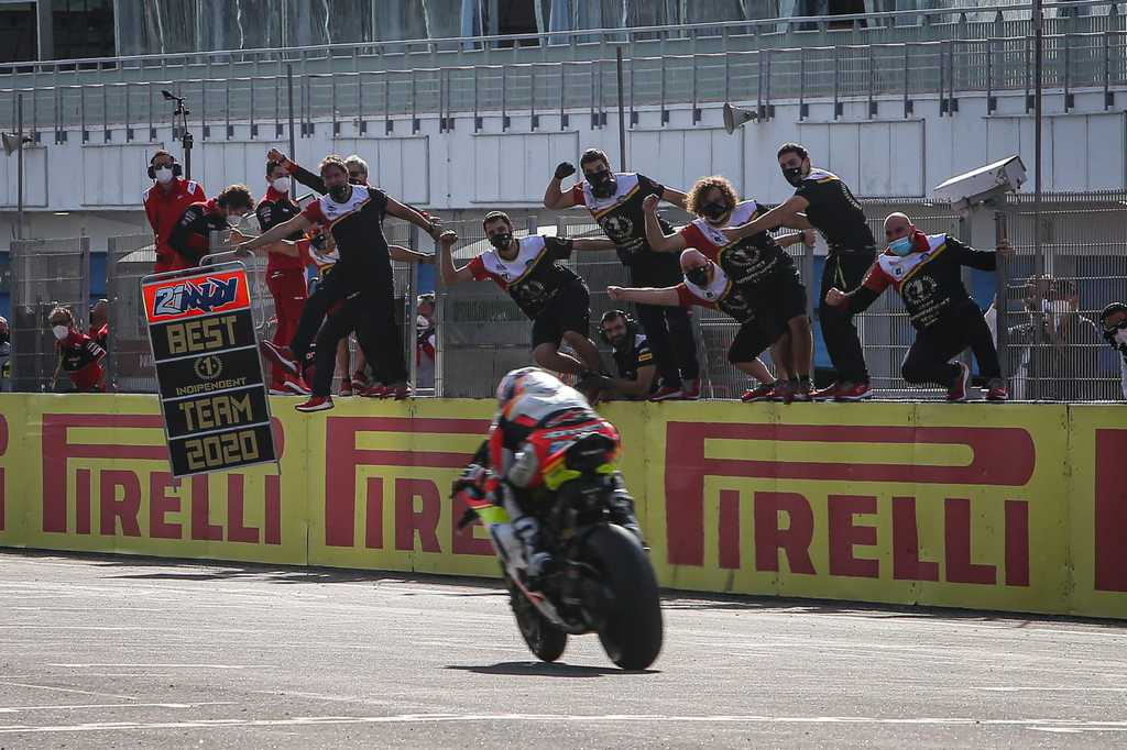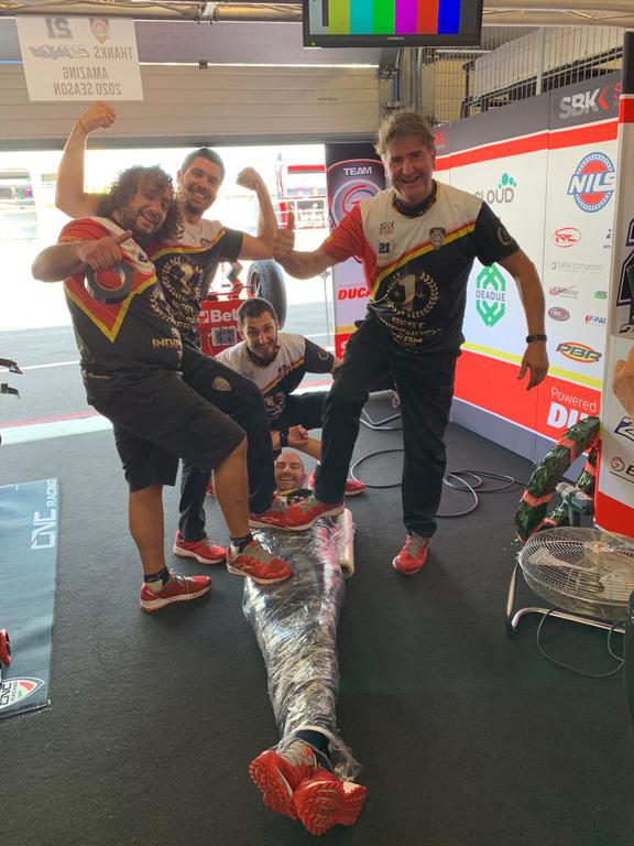 A fine agosto arrivava la doppia di Aragon, la prima volta che correvamo due domeniche consecutive sullo stesso circuito. Nel primo fine settimana Micheal mise a segno un quarto e quinto posto entrambi primi indipendenti e un ottavo in gara corta….noi eravamo già contenti. Per noi era molto, eravamo più costanti delle due Ducati ufficiali. Poi dopo qualche giorno di riposo cominciava il secondo week end di Aragon. Già dal venerdì eravamo costantemente nella prima posizione. Eravamo euforici ma continuammo a lavorare e a cercare di migliorarsi. In superpole segnammo il secondo tempo. In gara 1 saremmo partiti dalla prima fila…è impressionante la prima fila in sbk, come anche nelle altre categorie, ma quando mi son girato, ho visto, Redding, Lowes, van der mark, chaz davies, tom sykes, Bautista….erano tutti dietro eccetto Rea. Quella gara 1 l’abbiamo vinta. Nessuno ce l’ha regalata. Siamo stati in testa abbiamo lottato con il 6 volte campione del mondo e siamo andati via…non abbiamo vinto perché sono caduti o ritirati, abbiamo vinto perché siamo stati i più forti. Quando Rinaldi e la nostra Ducati passarono sotto la bandiera a scacchi feci un urlo con mille lacrime….piangevo, piangevo e piangevo, non riuscivo a credere a cosa avevamo fatto. Quel pomeriggio ero stordito da tutto quello che succedeva intorno, foto, urli, cori, podi, tutto il paddock ci fece i complimenti, eccetto qualche piccolo invidioso. Mi arrivarono mille messaggi sul telefono…più di 300. Tutto fu indescrivibile. Un sogno di una vita che si avverava. Vincere una gara di sbk con la nostra moto, una moto diversa da tutte le altre. Non una moto ufficiale, una moto nostra. Per noi il campionato poteva finire in quel momento, invece d li venivano altri podi e altri primi indipendenti. Domenica di gara 2 ad Aragon segnammo un terzo e un secondo posto. Da li dopo due settimane andammo a Barcellona e dopo un venerdi difficile non avendo fatto i test e alcune mosse giuste sul setup della moto tornammo nelle posizioni che contano. In ogni ingresso in pista andavamo sempre più forte e in gara 2 ci potevamo giocare un'altra vittoria…sarebbe stata un'altra vittoria…sapevamo che Micheal e la nostra moto erano i piu veloci….purtroppo un guasto tecnico al motore dal terzo giro ci ha fatto stare col fiato sospeso fino all’ultimo ma al penultimo giro siamo stati costretti al ritiro. Capita, le corse sono anche questo. Magny cours e l’Estoril hanno confermato il nostro lavoro e le nostre posizioni coronando il risultato di primo team indipendente nel campionato 2020. Questo ha cambiato molte cose, una gran soddisfazione personale, una pagina in più da aggiungere al curriculum, il mio primo anno con le sospensioni Ohlins racing, e la considerazione di noi nell’ambiente Ducati e sbk che in pochi hanno.